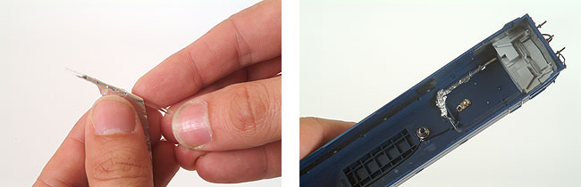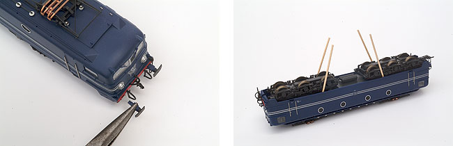 Het model staat bekend als lastig open te maken. Toch is dat helemaal niet zo moeilijk. Trek eerst de buffers uit de bufferbalken. Steek daarna vier tandenstokers tussen de klemmetjes van de kap. Je kunt de kap vervolgens met gemak van de loc trekken.