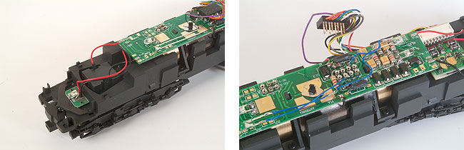 De twee witte LEDs heb ik vervangen door warm-witte LEDs van Conrad (bestelnummer 185877). Daarnaast komen er twee extra LEDs boven op de printplaat. De LEDs heb ik met dunne draadjes direct aangesloten op de stekker voor de decoder. Vergeet niet de weerstand in de blauwe massadraad. De blauwe draad is overigens niet echt een massa, maar een gemeenschappelijke plus. Houd hier rekening mee bij het aansluiten van de LEDs.