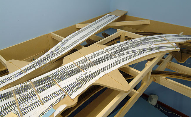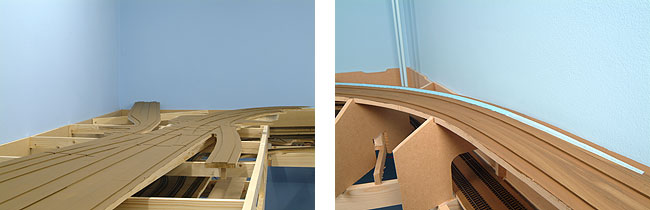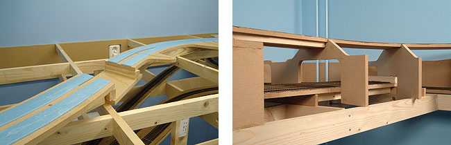 Als het landschap vrij vlak is, kun je bij de bouw van het bovenste niveau vaak volstaan met een dubbel lattenframe dat een maximale diepte van 4 cm toelaat. De techniek is zeer geschikt om snel grote vlakken te bouwen. Als het landschap grotere hoogteverschillen kent, kun je beter voor spanten kiezen. Net als bij een schip geven de spanten de contouren van de buitenkant - het landschap - aan. De spanten steunen direct op het basisframe. In de spanten zijn openingen uitgespaard voor de sporen op het onderste niveau.