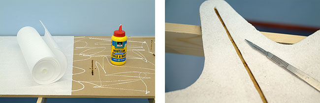 De ondergrond voor de rails wordt uitgezaagd uit 12 mm MDF. De stroken voor het schaduwstation schroef ik direct op het lattenwerk. Daarna plak ik een dun laagje schuim op het hout. Het schuim dempt het geluid en naden worden uitgevlakt. Het schuim is voor een habbekrats te koop bij elke bouwmarkt als ‘isolatiebehang’. Bij De Lage Zij heb ik voor de wisselaandrijvingen met geheugenmetaal gleuven in het hout gefreesd. De wisselaandrijvingen van Project Waldberg zijn verborgen door ze in de ondergrond te verzinken.
