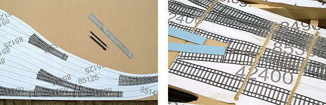 In het ontwerp van een modelbaan komen vaak vloeiende bogen en ingewikkelde wisselstraten voor. Dat is makkelijk ontworpen in de computer, maar je legt het niet uit de losse pols neer op een plaat hout. De lastigste delen van het ontwerp print ik op ware grootte uit. De blaadjes worden op het hout geplakt met spuitlijm. Als je het netjes doet, klopt de tekening bijna tot op de millimeter. Daarna hoef je alleen nog maar de lijntjes te volgen met een decoupeerzaag.