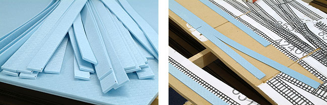 Rails die later een ballastbed krijgen, leg ik op smalle stroken vloerisolatie. Het blauwe spul haal je in grote pakken bij de Gamma en is ongeveer 3 mm dik. Met een scherp mesje versnijd je de platen tot repen van 2 cm breed. De smalle stroken kun je makkelijk in een boog buigen. Je legt de stroken langs de middellijn van de rails. Eerst leg je de ene helft en wanneer de lijm droog is de andere helft. Je kunt ook de kurkstroken van Faller gebruiken, maar dit is veel goedkoper en makkelijker.