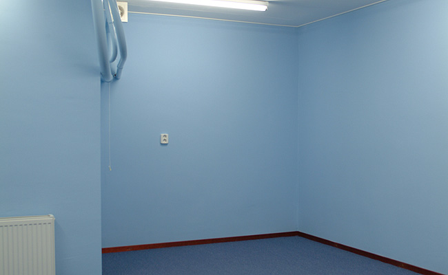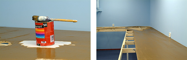 In april 2004 is het eindelijk zover. Na maanden van voorbereiding en bouwen is de nieuwe kelder onder mijn huis klaar. De ruimte is met zes bij vijf meter erg royaal. Ook de hoogte is met 2,30 meter dik in orde. Voor ik aan De Lage Zij begon heb ik eerst het plafond voorzien van een negen tl-buizen. Zo heb je overal lekker veel licht en dat is met al dat gepruts erg fijn. De muren zijn alvast blauw geschilderd als basiskleur van de lucht. De wolken en het landschap worden later ingetekend.