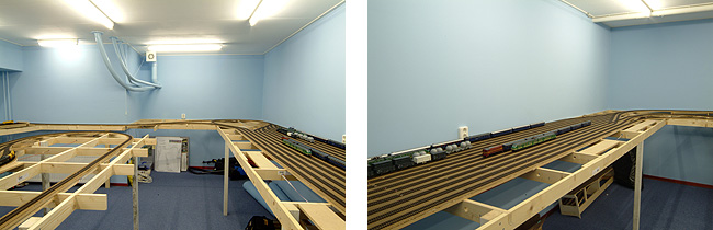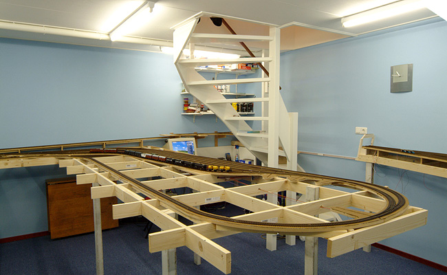 Oktober 2004. De bouw van het onderste niveau schiet lekker op. De tafels zijn gebouwd en alle rails liggen op hun plaats, zoals hier bij het midden van de baan. Oplettende kijkertjes zien een gat in de baan bij de trap. Daar komt een uitneembare sectie die wordt weggehaald als de baan niet in bedrijf is. Zo blijft de trap over de volle breedte begaanbaar.