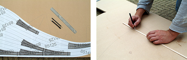 Voor het zover was, is er heel wat gebeurd. In het ontwerp van de baan komen diverse vloeiende bogen en ingewikkelde wisselstraten voor. Dat is makkelijk ontworpen in de computer, maar je legt het niet zo maar even uit op een plaat hout. Daarom heb ik de lastigste delen van het ontwerp op ware grootte uitgeprint.
