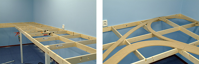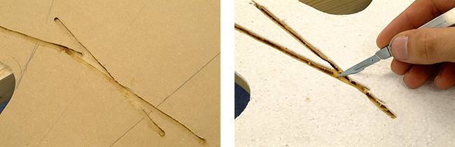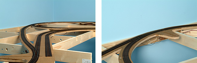 Wanneer de onderbouw op zijn plaats ligt, volgt de bekende route van afbouwen. Eerst worden de gleuven voor de wisselaandrijvingen gefreesd met bovenfrees. Vervolgens wordt al het hout bedekt met een dun laagje schuim. Na het drogen van de lijm worden de gleufjes opgesneden met een scherp mesje. Tenslotte wordt alles aardebruin geschilderd.