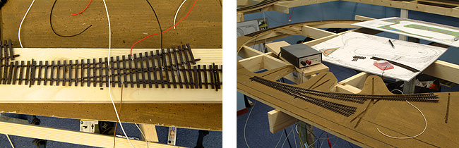 De wissels moeten precies boven de gleuven komen. Het is dus handig om eerst de wissels neer te leggen en dan pas de rest van de rails op hun plaats te brengen. De draadjes soldeer ik van tevoren tegen de onderkant van de spoorstaven. Zo zie je er straks helemaal niets meer van. De aandrijvingen van de gemonteerde wissels worden direct getest en optimaal afgesteld.