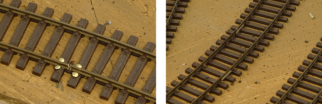 In een boog komt behoorlijk wat kracht te staan op de railverbindingen. Als je een plastic raillas gebruikt om een isolatie aan te brengen, krijg je snel een lelijke knik in het traject. Je kunt beter eerst de rails vastleggen. Daarna vervang je rond de plaats van de isolatie de railstoelen door vier koperen spijkertjes. Je kunt dan de rail doorslijpen zonder dat er nog iets verschuift en je hebt een perfecte isolatie. Met gewone raillassen loop je tegen hetzelfde probleem aan. Door de raillassen verschoven te monteren heb je er geen last van. Zelfs in een scherpe boog kun je flexibele rails zo netjes aan elkaar knopen.