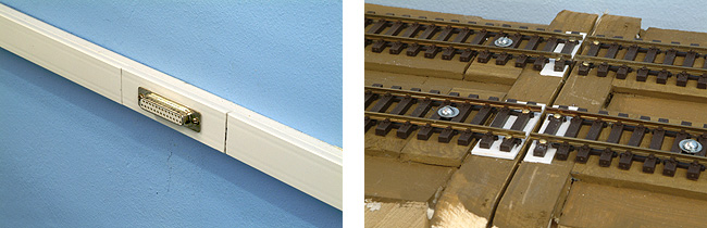 Op de muur zit een kleine kabelgoot met een 25-pens connector. De stekker van de sectie wordt in de connector geplugd. De rails aan beide zijden van de sectie worden ook via deze stekker van spanning voorzien. Wanneer de sectie is verwijderd, komen de toevoersporen dus automatisch zonder spanning te staan. Een trein kan zo nooit het gat in rijden.