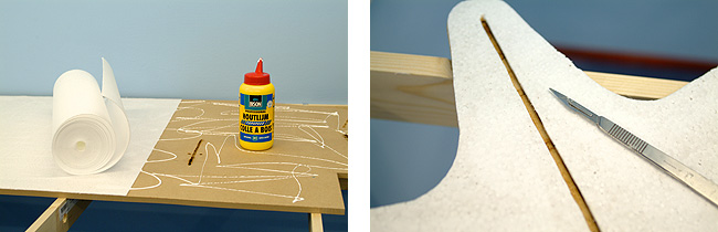 De ondergrond voor de rails wordt uitgezaagd uit 12 mm MDF. De stroken voor het schaduwstation worden direct op het lattenwerk vastgeschroefd. Daarna plak ik een dun laagje schuim op het hout. Het schuim dempt het geluid en naden worden uitgevlakt. Het schuim is voor een habbekrats te koop bij elke bouwmarkt. De gleuven voor de wisselaandrijvingen met geheugenmetaal worden uit het schuim gesneden.