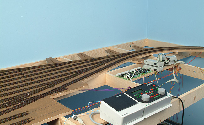 Juni 2004. Niet lang na het begin liggen de eerste rails al op hun plaats. De foto toont de toegang tot schaduwstation A (zie ontwerp). Het achteloze stapeltje elektronica rechts bestaat uit terugmelddecoders van verschillende pluimage. Onder de baan zijn er ook al de nodige gemonteerd om de sporen op aan te sluiten. Uiteindelijk komen de Viessmann 5233 decoders als voordeligste oplossing uit de test.