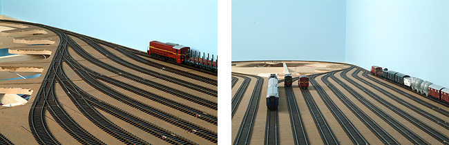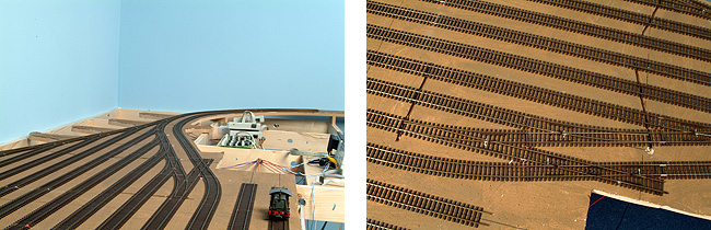 Even een kijkje de andere kant op. De sporen van het schaduwstation komen samen in een waaier van wissels. Het was een behoorlijke klus om de hele wisselstraat strak te krijgen. De Tillig wissels zijn niet allemaal even recht en de ene spoorstaaf is nog wel eens langer dan de andere. Secuur werken en heel veel opmeten is de enige manier om het echt goed te krijgen.