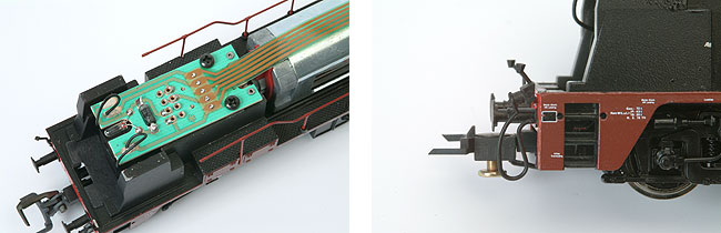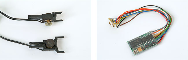 Het inbouwen van de decoder is een fluitje van een cent. De loc is voorzien van een NEM connector en de decoder heeft een NEM stekker. Nadat je de zwarte dummy stekker hebt verwijderd, wordt de decoder zo in de loc geprikt. Je kunt gelijk een proefrit maken als je wilt. De Krois koppelingen nemen de plaats van de Roco koppelingen in. De koppelingen hebben twee draadjes. Het lange draadje is de plus en het korte draadje is de min. De draadjes gaan via de draaistelopeningen naar binnen. De lange draadjes worden verbonden met de blauwe draad van de decoder. De korte draadjes worden aangesloten op het bruine draadje. Ze zijn zo tegelijk via dezelfde functietoets te bedienen.