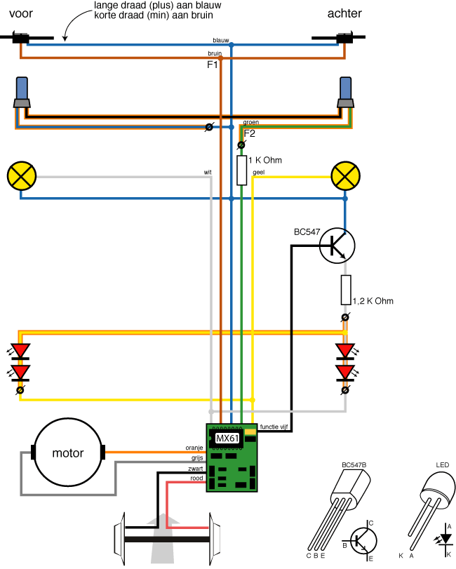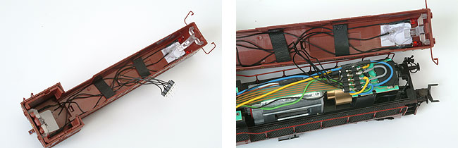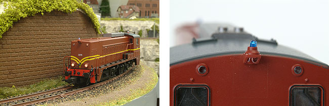 Het aansluiten van al die extra lampjes is niet moeilijk, maar wel een peuterkarweitje. Ik heb een vijfpolige stekker opgenomen in de draadjes, zodat de kap demontabel blijft. De zwaailichten worden in serie aangesloten op het blauwe en het groene draadje. In het draadje wordt ook een weerstandje van 1 kilo Ohm opgenomen. De LEDs gebruiken dezelfde aansluitingen als de frontverlichting aan de tegenovergestelde zijde van de loc. Ook hier moet je weerstandjes gebruiken om te voorkomen dat ze doorbranden. Ik heb de vijfde functie-uitgang van de Zimo decoder benut om een extra transistor aan te sluiten. Via de transistor is de sluitverlichting uit te schakelen als de loc een trein trekt.
