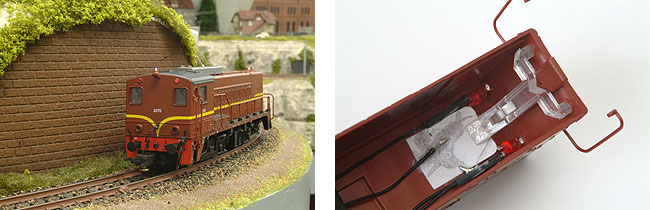 Ik wilde het model ook graag voorzien van werkende sluitverlichting. De lampglaasjes zijn reeds aanwezig, maar bij twee van de vier zijn ze aan de achterkant dichtgemaakt. Met een scherp mesje haal je dat beetje plastic zo weg en worden de glaasjes doorzichtig. Achter de glaasjes komen kleine rode LEDs. De LEDs staan per kant van de loc in serie. Het is verreweg het makkelijkst om de LEDs eerst aan elkaar te solderen en ze daarna met een beetje secondelijm achter de openingen van de sluitlichten te plakken. Pas wel op dat de draadjes van de LEDs niet de draadjes van de zwaailichten raken.