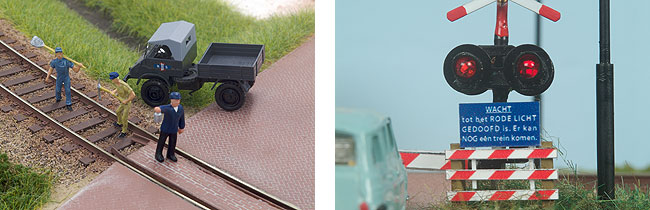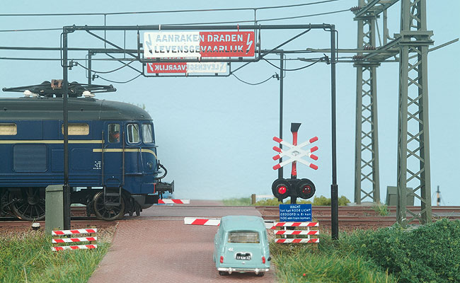 Vroeger hing er bij een spoorlijn met bovenleiding steevast het bord “Aanraken Draden Levensgevaarlijk” boven de overweg. Henckens heeft het bord ook in model en het maakt de overweg net helemaal af. Een echte aanrader voor elke tijdperk 3 liefhebber. Als je niet van prutsen met geheugendraad houdt, heeft Conrad een interessant alternatief. Onder nummer 240618 bieden ze een aandrijving met servo aan. Daarmee krijg je de AHOB ook ongetwijfeld open en dicht.