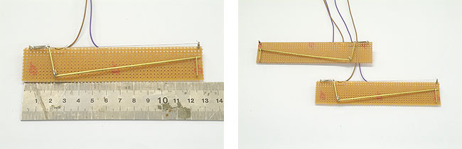 Omdat ik al goede ervaringen had met geheugendraad als wisselaandrijving, wilde ik dat ook gebruiken voor de AHOB. Voor een wissel is een beweging van 3,5 à 4 mm voldoende, maar voor de slagbomen is een beweging van ongeveer 1,5 cm nodig. Hiervoor heb ik een speciale aandrijving op een stukje printplaat gebouwd. De aandrijving heeft een stukje geheugendraad van ongeveer 10 cm lang. De draad is met behulp van een veertje tussen twee printpennen gespannen. De beweging van de draad wordt via een gebogen messing buisje vijf maal vergroot.