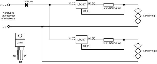 Geheugendraad vraagt om een andere aansturing dan een magneetspoel of een wisselmotor. Er loopt óf helemaal geen stroom (ruststand) óf permanent stroom (aangetrokken toestand) door de draad. De stroom moet begrensd worden op 200 mA. Een handjevol elektronica is voldoende om dit te regelen. De schakeling moet gevoed worden met 12 Volt gelijkstroom. De diode blokkeert de spanning bij een verkeerde polariteit. De LM317 wordt redelijk warm en moet voorzien zijn van een koellichaam. De lampjes van de AHOB heb ik aangesloten op de OM32 die ik toch al in gebruik had bij De Lage Zij.