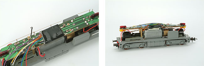 Voor het inbouwen van de decoder moeten we aan de binnenkant zijn. De kap wordt op zijn plaats gehouden door diverse nokjes aan de zijkanten van beide neuzen. Openmaken is een kwestie van voorzichtig indrukken en de kap naar boven van de loc trekken. Het interieur van de loc is een reis terug in de tijd. De printplaat is nogal grof opgezet en de motor is ook een tikkeltje ouderwets. Uiteraard is een NEM connector voor de decoder in geen velden of wegen te bekennen.