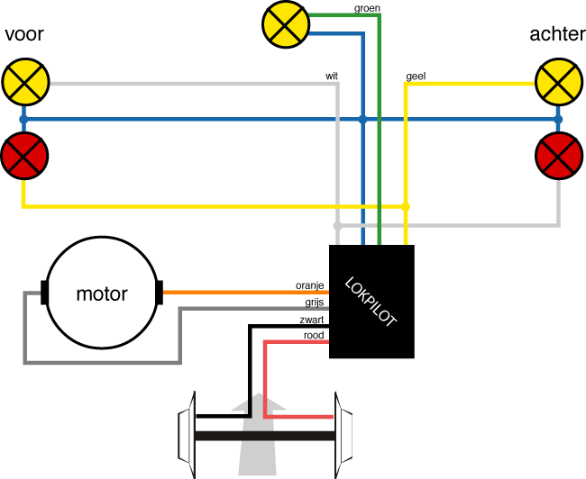De andere kant van de lampjes wordt aangesloten op het witte en het gele draadje. Het witte draadje gaat naar het gele lampje aan de voorkant en naar het rode draadje aan de achterkant. Het gele draadje wordt precies andersom aangesloten. Verder heb ik een lampje in de cabine gebouwd. Het is aangesloten op het blauwe en het groene draadje. Het paarse draadje is niet nodig en kan worden afgeknipt.