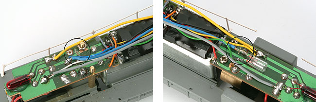 De andere draadjes zijn nu ook snel aangesloten. De oranje en de grijze draad zijn bestemd voor de motor. De oranje draad gaat naar het rode draadje van de motor en de grijze draad naar de zwarte. Een stukje krimpkous (te koop bij de elektronicawinkel) is uitermate geschikt om de verbindingen te isoleren. Dan is de verlichting aan de beurt. Een van de baantjes op de printplaten is de gemeenschappelijke massa van de lampjes. Oorspronkelijk is dit hetzelfde baantje als de zwarte (massa) draad van de rails. Nu wordt het baantje vlak na de massaverbinding doorgekrast. De juiste plaats is in de foto’s aangegeven. Het overgebleven stuk van de baantjes wordt aangesloten op het blauwe draadje.