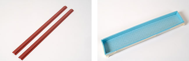 Links zie je het origineel. In dit geval zijn het muurdelen van de chocoladefabriek die op De Lage Zij staat. Op dezelfde manier heb ik overigens ook de perronwanden en de klinkerstraten gemaakt. Uit afvalmateriaal maak je een bakje waar het origineel ruim in past. De mal moet bij voorkeur randen hebben die minimaal een halve centimeter dik zijn. Het bakje moet dus een centimeter groter en een halve centimeter groter zijn dan het origineel.