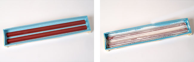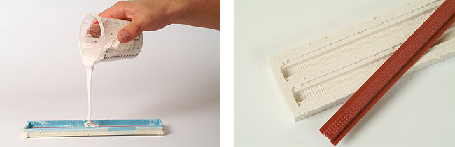 Het bakje wordt gevuld met siliconenrubber. Giet het mengsel rustig uit en zorg dat het zich gelijkmatig over het origineel verdeeld. Leg het bakje daarna 24 uur weg op een warme plaats, bijvoorbeeld op de verwarming. Maak de maatbeker niet gelijk schoon. Je kunt beter het rubber hard laten worden. Je trekt het spul dan zo uit de beker. Kijk uit voor je kleren. Siliconenrubber lost niet op in water of terpentine. De volgende dag kun je het bakje en het origineel verwijderen. Je houdt nu de mal over.