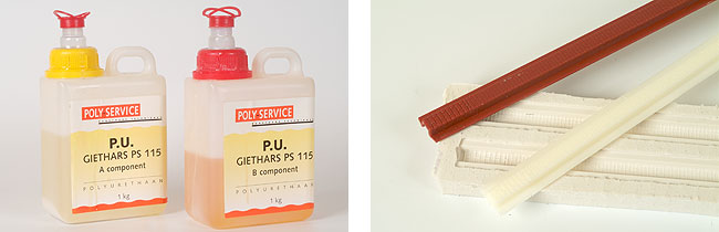 Het moment is aangebroken om de kunsthars ter hand te nemen. Behalve kunsthars kun je ook gips gebruiken om afgietsels te maken. Dat is leuk voor een dikke muur, maar voor dunne onderdelen is gips veel te breekbaar. De kunsthars bestaat eveneens uit twee componenten. De componenten worden 1:1 in een maatbeker gemengd. Bereken van te voren hoeveel inhoud je nodig hebt. Met kunsthars moet je snel werken. Binnen een paar minuten worden het spul hard. Een half uur later kun je het voorwerp al uit de mal halen. Zo kun je heel wat exemplaren op een dag produceren.