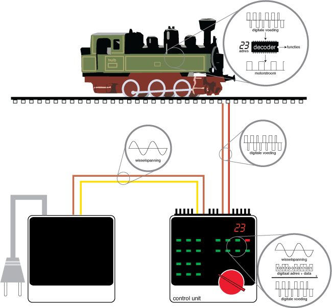 Elke decoder heeft een uniek digitaal adres. Wanneer je een locomotief wilt laten rijden, dan stuurt de centrale eenheid een serie opdrachten naar de decoder in de loc. De decoder voert de opdrachten uit en de loc gaat rijden. Zo zijn ook frontseinen, rookgenerator en automatische koppeling los van elkaar en op afstand te bedienen. Door gebruik te maken van verschillende adressen zijn alle locs individueel te besturen.