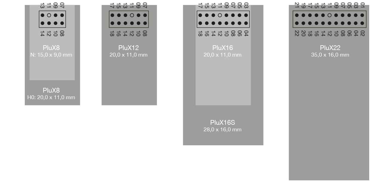 Plux8 en PluX12 zul je met name in TT en N modellen tegenkomen, PluX16 en PluX22 in H0 modellen en groter. Van de PluX16 bestaat nog een variant, de PluX16S (S=Sound). De connector is gelijk, maar er wordt rekening gehouden met meer ruimte voor een geluidsdecoder.