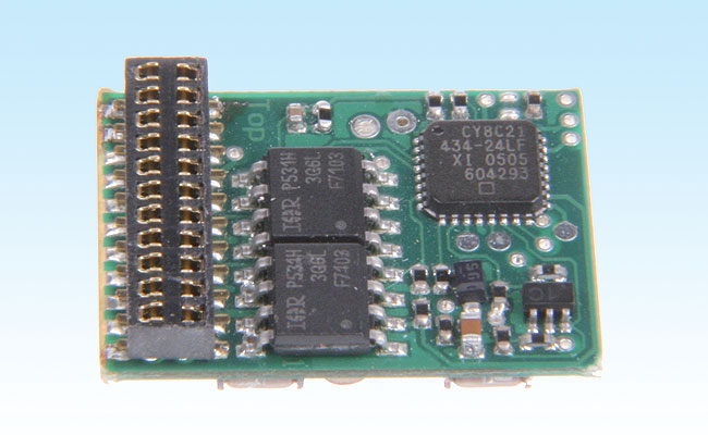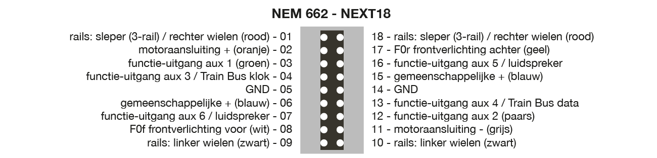 NEXT18 zul je met name tegenkomen in schaal N en TT en misschien in kleinere H0 modellen. De steker op decoder is een klontje plastic die in de connectoren in de loc valt. Zoals de naam al aangeeft, gaat deze standaard uit van 18 aansluitingen. Ze zijn zo gekozen dat het verkeerd insteken van decoder geen kortsluiting geeft. Naast de aansluitingen voor een klassieke gelijkstroom- of klokankermotor is er ruimte voor 7 functies.