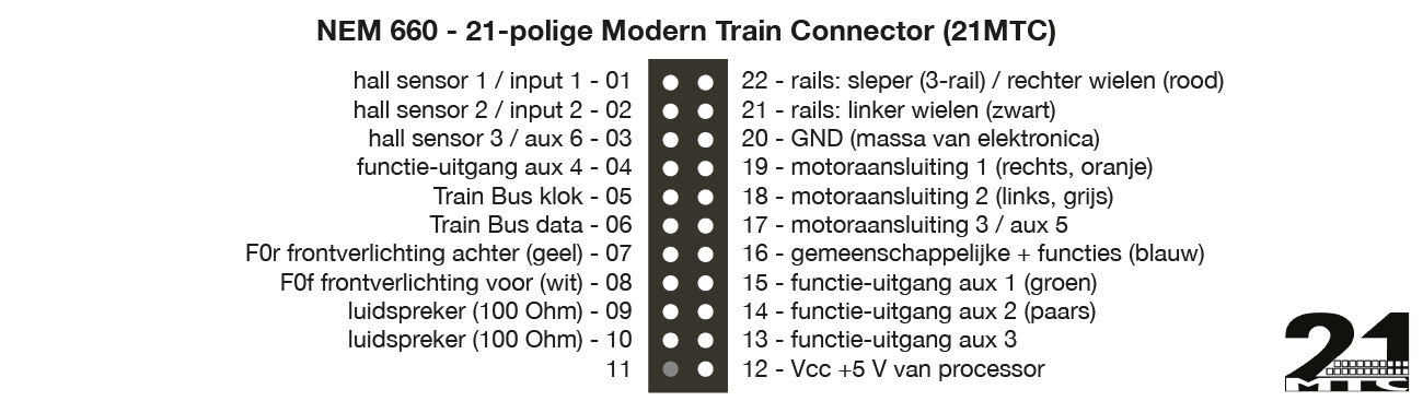 De 21-polige MTC connector is gebaseerd op een kleinere 22-polige connector. Om verkeerd aansluiten te voorkomen is één pennetje blind uitgevoerd. De C-Sinus motor van Märklin kan via de connector worden aangestuurd; hiervoor zijn extra aansluitingen voor de motor en de sensoren opgenomen. Helaas gaat dit wel ten koste van het aantal beschikbare functie-uitgangen en dat is precies de reden waarom andere fabrikanten de 21MTC niet zo zien zitten. Märklin lijkt ook zelf steeds meer van de C-Sinus motor af te stappen. Nog wat vaag is de 'Train Bus'. Blijkbaar is het de bedoeling om in de toekomst verschillende decoders in dezelfde trein met elkaar te laten communiceren. De steker zit in de loc, aan de decoder komt een passende connector.