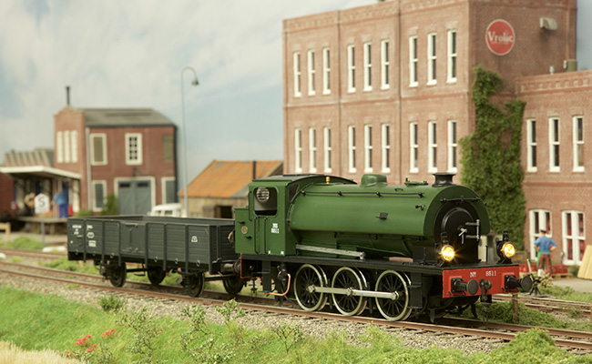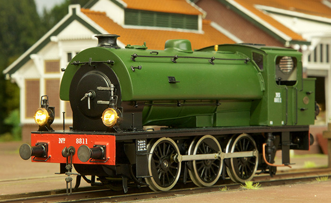 Het model heb ik eerst gestraald met aluminiumoxide en daarna gespoten met Philotrain/Phildie verf. De voetplaat van de loc is zwart, de ketel en het machinistenhuis loc zijn stoomlocgroen. De schoorsteen, de handrails, de lantaarns en de binnenzijde van het machinistenhuis zijn weer zwart. De bufferbalken zijn natuurlijk rood. Diverse details zet je apart aan met wat Revell in de kleur koper, messing of blank metaal. De watertransfers heb ik zelf gemaakt en de fabrieksschilden zijn geëtst bij PPD. De loc is voorzien van een LokPilot 4.0 met stroombuffer. In de lantaarns zijn kleine SMD LEDjes gebouwd.