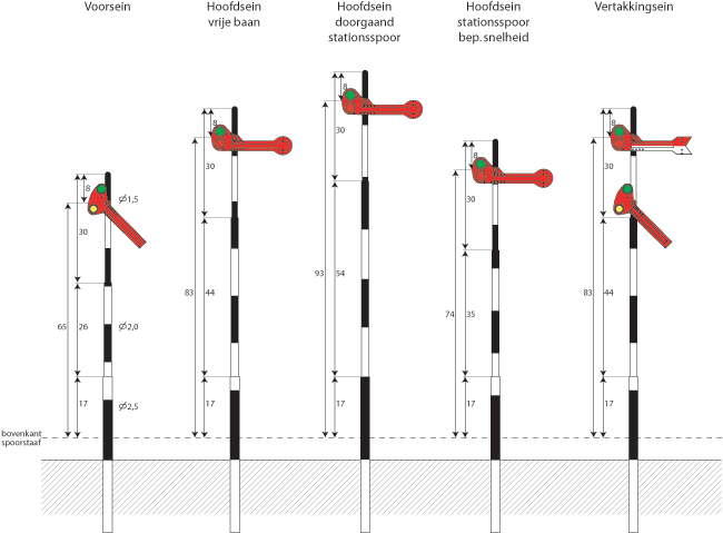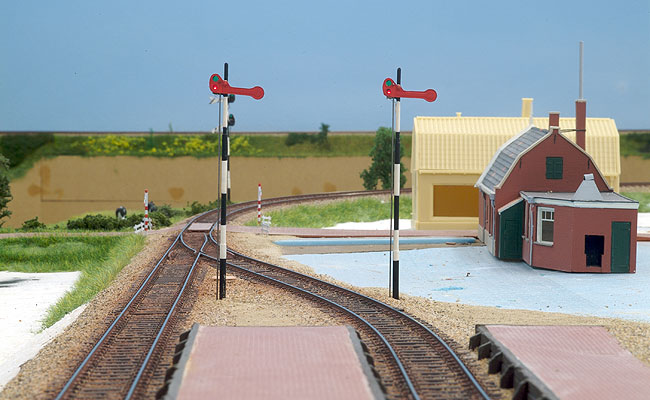 Het klassieke Nederlandse seinstelsel is redelijk complex. Gerard van de Weerd beschrijft het op zijn site tot in het detail. Bij De Lage Zij heb ik me beperkt tot de eenvoudige armseinen met een enkele mast. De grote bordesseinen kwamen op een zijlijntje toch nauwelijks voor. De tekening geeft de seinen weer in schaal H0.