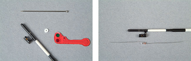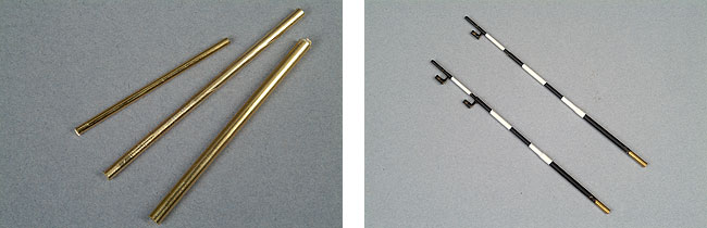 De eerste stap is het samenstellen van de mast. De mast bestaat uit twee messing buisjes van 2,5 mm en 2,0 mm en een messing staafje van 1,5 mm. De binnenkant van de buisjes wordt over een lengte van 4 mm iets opgeboord, zodat de drie delen in elkaar passen. Even solderen en de basismast is klaar.