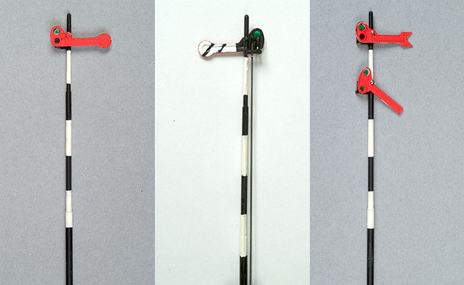 Zo ziet een gemonteerd sein er uit. Het hoofdsein heeft een rode vleugel met een rond uiteinde. De achterkant van het sein is zwart/wit met twee diagonale zwarte strepen in het witte vlak. De strepen breng je het makkelijkst aan met een zwarte viltstift. Het vertakkingsein herken je altijd aan de gevorkte seinarm. De onderste helft van de arm moet nog wit worden geschilderd.