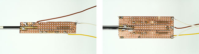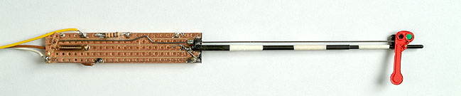 Het lamphuis is een stukje messingbuis van 2,0 mm diameter, waarvan de binnenkant is uitgeboord tot 1,5 mm. Zo past er net een klein lampje in. Via een haaks gat van 1,5 mm kan het licht naar buiten schijnen. Het lamphuis wordt met een messingstripje aan de mast gesoldeerd. De afstand ten opzichte van het draaipunt luistert nauw. Het gat in het lamphuis moet precies samenvallen met de gaten in de seinarm. Boor dus eerst het gaatje voor het draaipunt, voor je het lamphuis bevestigt.