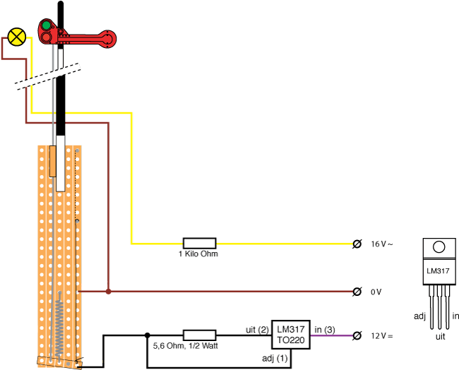 Een handjevol simpele elektronica is voldoende om de seinen tot leven te brengen. De aandrijving wordt aangestuurd met 12 Volt gelijkspanning. De LM317 begrenst de stroom door de aandrijving op 200 mA. Het IC wordt aardig warm en moet voorzien worden van een koellichaam. Het seinlampje wordt via een weerstandje aangesloten op 16 Volt wisselspanning.