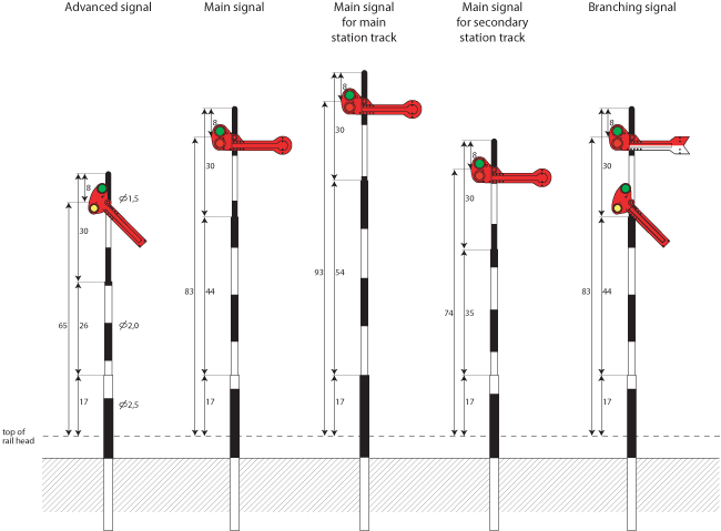 The classical Dutch signalling system is quite complex. Gerard van de Weerd describes the system in great detail on his – Dutch – website. On De Lage Zij I confined myself to the simple semaphores with a single pole. On main lines one could find very complex constructions with several semaphores combines into one signal. These are quite hard to model and would be out of place on a branch line like mine. De drawing represents the most common signal in H0 scale.