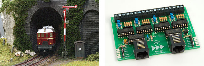 De secties kun je zo kort of lang maken als je wilt. Elke sectie is een bezetmelder en wordt aangesloten op een andere ingang van de terugmelddecoder. Bijvoorbeeld de BMD16N. Normaal is de spoorstaaf nergens mee verbonden en is het terugmeldcontact ‘onbezet’. Wanneer er echter een loc of wagen in de sectie staat, zullen de assen beide spoorstaven verbinden. Het terugmeldcontact wordt dan ‘bezet’.