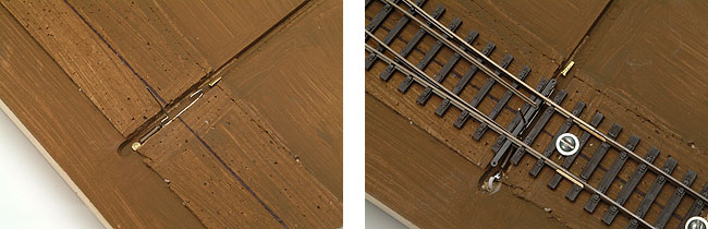 De eerste stap is het frezen van een ondiepe geul onder het wissel. Met een bovenfrees heb je dat zo gedaan. Na het schilderen van de ondergrond wordt de aandrijving in de geul bevestigd. De paperclip wordt verbogen tot een dubbele haak die het veertje en de draad met elkaar verbindt. De lange poot van de haak trekt het wissel om. Wanneer je de baan hebt afgewerkt, is er van de aandrijving niets meer te zien.