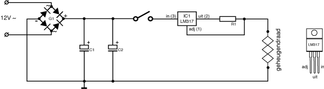 Het geheugenmetaal heeft een stroom van 200 mA nodig om maximaal samen te trekken. Je kunt het niet direct op een treintransformator aansluiten, omdat de hoge spanning voor een veel te grote stroom zorgt. Met een beetje elektronica is dat probleem snel opgelost. De LM317 spanningsstabilisator is prima te gebruiken is als constante stroombron. Met een weerstandje wordt de uitgangsstroom begrensd tot 200 mA. Het maakt niet uit hoe lang de draad is. De LM317 wordt gevoed met 12V gelijkspanning en moet voorzien worden van een koellichaam.