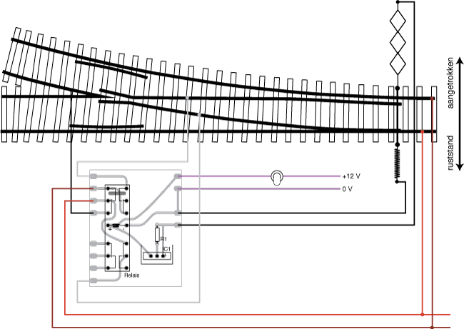 De schakeling is genoeg om het wissel te verzetten, maar bij een 2-rail baan moet ook het puntstuk worden omgepoold. Dat is eenvoudig te realiseren door een relais parallel aan de LM317 te zetten. Het relais schakelt de spanning om die op het puntstuk van het wissel staat.