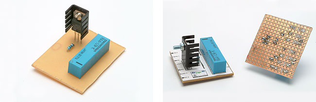 De complete schakeling is makkelijk op een klein printje te bouwen. Je kunt zelf een print etsen of gebruikmaken van strokenprint. De laatste optie is sneller, makkelijker en goedkoper. Ik zaag eerst de printjes op maat en plak een etiket op de bovenkant. Zo weet ik precies waar wat moet komen en hoef ik niet steeds de gaatjes uit te tellen.