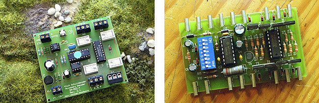 Schakeldecoders lijken op wisseldecoders, maar de uitgangen geven een permanent signaal af. Je gebruikt een schakeldecoder bijvoorbeeld om een lichtsein aan te sluiten of de verlichting van een perron te schakelen. De meeste schakeldecoders zijn eigenlijk wisseldecoders met vier ingebouwde relais. Een korte puls zet het relais om en het relais schakelt de uitgang.