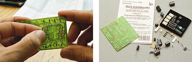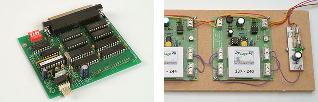 Voor Project Waldberg heb ik hoofdzakelijk wisseldecoders van Märklin en Viessmann gebruikt. De decoders schakelen zowel de wissels als de armseinen. Bij De Lage Zij heb ik het anders aangepakt. Omdat ik heb gekozen voor wisselaandrijvingen met geheugendraad, gebruik ik schakeldecoders om de wissels te verzetten. Alle decoders zijn DCC decoders van LDT, namelijk de S-DEC-4-DC. De lichtseinen worden aangestuurd met OM32Serial modules van Leon van Perlo. De modules zijn goedkoper en beter dan lichtseindecoders. Ze worden rechtstreeks aangesloten op de seriële poort van de computer. Vanuit het programma Koploper kun je ze aansturen als gewone decoders.