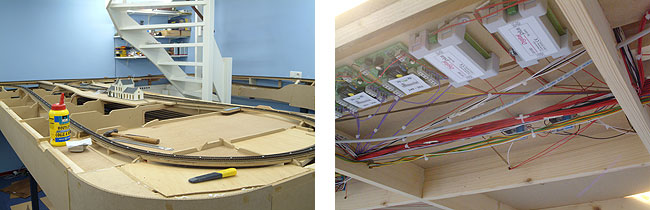 The upper level is about 125 cm over the floor. The main line forms a long parading track. Trains can be followed along the entire room. The branch line finds its way in the centre. It runs from the station to a third hidden yard. The plan is based on wide curves and narrow-angle points. All curves start with a transitional curve, which results in nicely flowing lines.