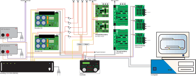 Het hart van de besturing wordt gevormd door de Intellibox van Uhlenbrock. Het apparaat wordt hier als pure DCC centrale gebruikt. De hele baan is elektrisch gezien verdeeld in vier secties. Twee boosters van 6A voeden elk twee secties. In geval van storingen kunnen de secties per stuk worden uitgeschakeld, zodat een kortsluiting sneller te vinden is. De Intellibox levert alleen spanning aan de wissel- en seindecoders.